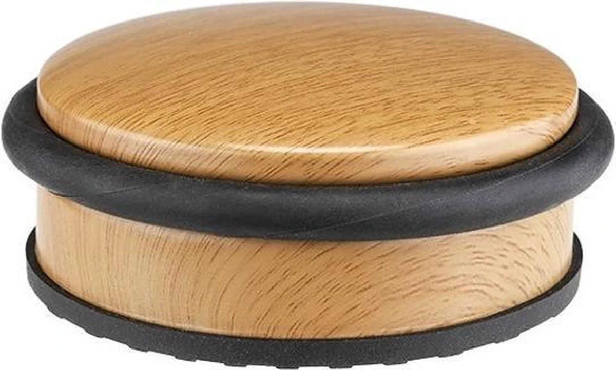 Kleine metalen deurstopper 10 x 4,5 cm met bamboe coating waardoor het eruit ziet als een bamboe houten deurstopper. Het formaat van deze deurstopper is: 10 x 4,5 cm. Materiaal: metaal. Gewicht: ongeveer 1100 gram.