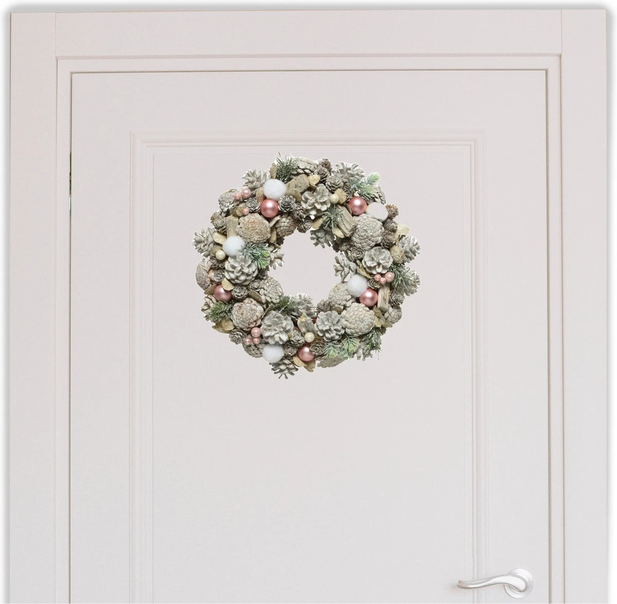 Kerstkrans/dennenkrans met sneeuw en roze decoratie D34 cm. Diameter: 34 cm. Dikte: 8,5 cm. Kerstkransen/kransen voor aan de deur. Hanger niet inbegrepen Materiaal: kunststof. Deurkransen/decoratiekransen.