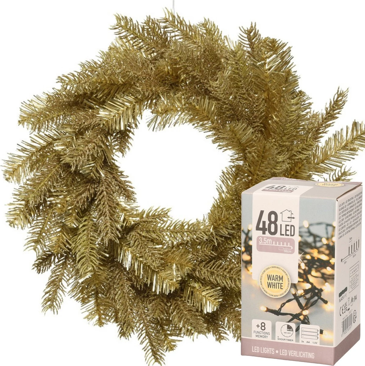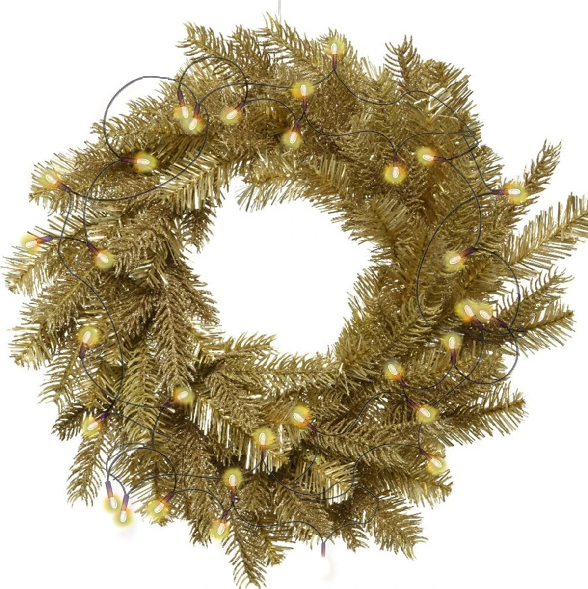 Kerstkrans/dennenkrans goud glitter 50 cm incl. verlichting warm wit. Kerstkrans/dennenkrans inclusief verlichting warm wit. Aantal lampjes: 48. Lengte lichtsnoer: 4 meter. Formaat krans: D50cm.