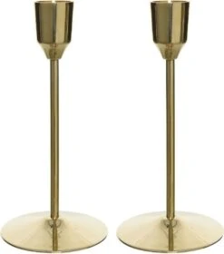 Luxe dinerkaarsen kandelaars set van 2x stuks aluminium 15 en 20 cm in de kleur goud. Diameter onderkant is 7 cm. Staande kaarsenhouders voor op tafel of vensterbank.