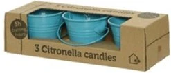 Set van 3x stuks anti muggen Citronella kaars in blauw zinken potje. Citroengeur/citrusgeur verjaagt muggen. Anti muggen citronella kaarsen. Deze kaarsjes tegen insecten hebben 5 branduren per stuk. Hoogte: 6 cm.