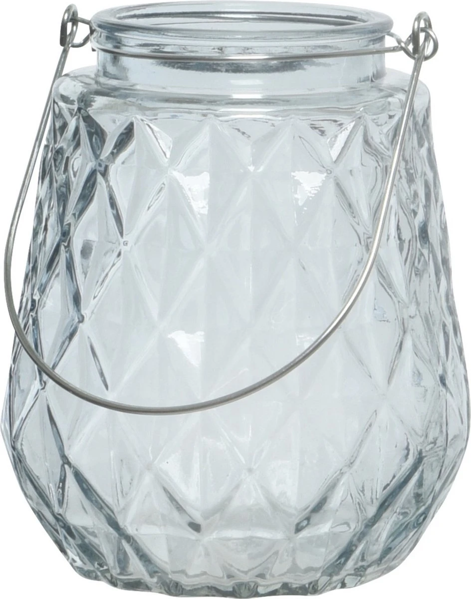 Theelichthouders/waxinelichthouders ruitjes glas ijsblauw met metalen handvat 11 x 13 cm. Ijsblauwe glazen theelichthouder met ruitjeseffect. De ruitjes in het glas zorgen voor een leuk effect zodra er een brandend kaarsje in gezet wordt. Materiaal: glas. Formaat: ca. 11 cm in diameter en 13 cm in hoogte. Kaarsenhouders/windlichten voor waxinelichtjes/kaarsjes/theelichtjes.